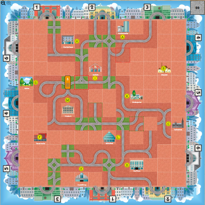 Anmerkung: Sobald ein Spieler seine Strecke vollendet hat und seine Straßenbahn bewegt, dürfen alle anderen Mitspieler seine Schienen-Plättchen benutzen. Statt 5 Plättchen stehen somit jedem Mitspieler dann 10 Schienen-Plättchen zur Verfügung.